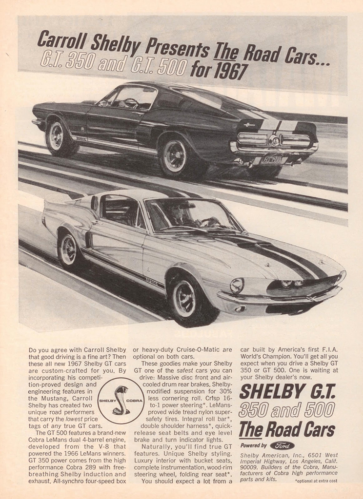 In the 1960s Shelby raised the profile of American racing machines on the international sports car circuit by packing powerful Ford V-8 engines into lightweight British roadsters as well as developing competition cars for Ford. His Shelby Cobras proved themselves against the likes of Ferrari, Maserati and Jaguar: they became prized collector’s items and today can command six- and seven-figure prices (see my earlier post “Mustang“).